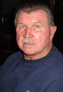 we went back to ditka ... they posed, i took a flashless picture. it was too dark, so i advised mike to close his eyes as the flash was imminent. he took one for the team, so to speak, and the picture is perfect. ben is in touchdown formation.